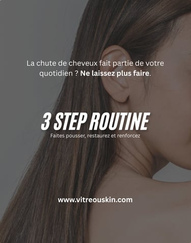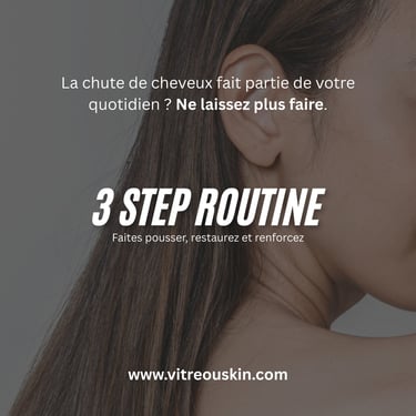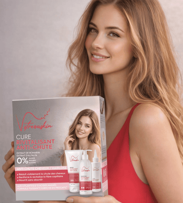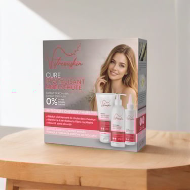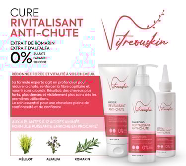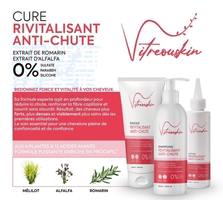 Vitreouskin : Cure Revitalisant Anti-Chute Sa formule experte, enrichie en Procapil®, aux 4 plantes et 12 acides aminés (dont le Romarin, l'Alfalfa et le Mélilot), agit en profondeur pour réduire visiblement la chute des cheveux. Ce soin essentiel renforce et revitalise la fibre capillaire tout en nourrissant sans alourdir, garantissant des cheveux plus forts, plus denses et plus sains dès les premières utilisations. Garantie sans sulfate, paraben ni silicone, cette cure complète (Shampoing, Masque et Lotion) redonne force, vitalité et brillance à votre chevelure.