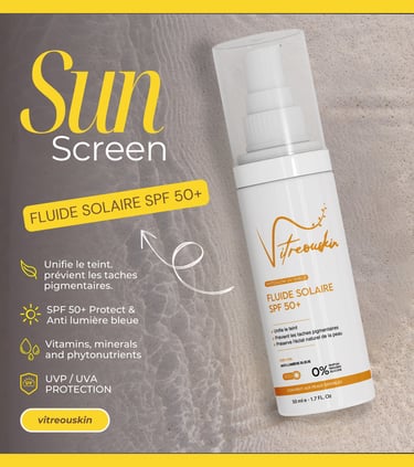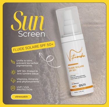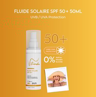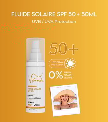 FLUiDE SOLAiRE SPF 50 + 50ML UVB / UVA Protection est un écran solaire léger qui protège contre les rayons UVA/UVB et la lumière bleue. Absorption rapide et idéal pour un usage quotidien, il unifie le teint et préserve l’éclat naturel de la peau, convenant à tous les types de peau, même sensibles.