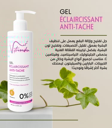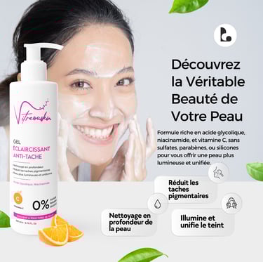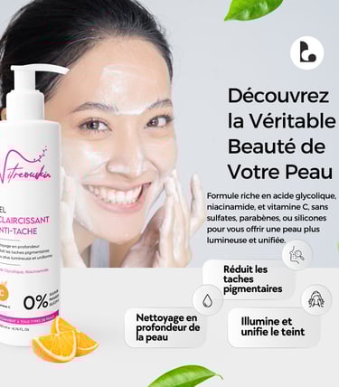 Un gel anti-tache qui réduit les pigmentations et unifie le teint avec de l'acide glycolique, niacinamide, et vitamine C. Convient à tous types de peau et sans sulfates, parabènes, ni silicones.